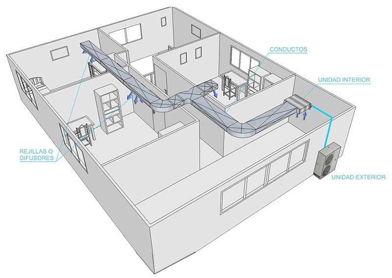 El funcionamiento es simple: la unidad interior se conecta a una red de conductos de impulsión de aire y (no siempre) a otra red de conductos de retorno de aire. El equipo no hace más que tomar el aire de la estancia por el conducto de retorno, enfriarlo/calentarlo e impulsarlo de nuevo por el conducto de impulsión .